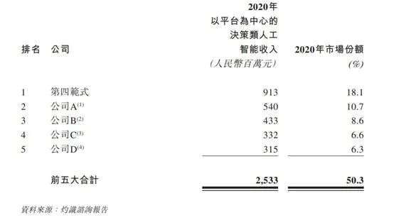 招股书显示,决策类AI市场前五大企业,除了第四范式,剩下四家都是巨头。根据附注中四家公司的总部所在地与业务介绍,可知A公司是百度,B公司是阿里,C公司是华为,D公司是腾讯。