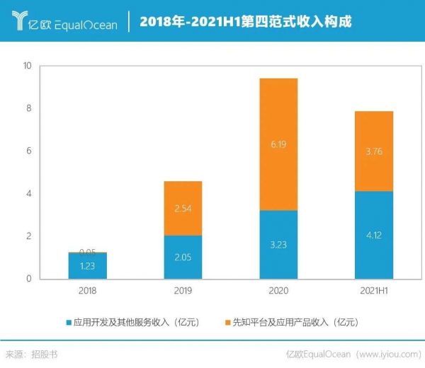 2018-2020、2021上半年,先知平台及应用产品产生的收入分别为523万元、2.54亿元和6.19亿元、3.76亿元,同期营收占比分别为4.1%、55.3%、65.7%、47.7%;应用开发及其他服务收入分别为1.23亿元、2.05亿元、3.23亿元、4.12亿元,同期营收占比分别为95.9%、44.7%、34.3%、52.3%。