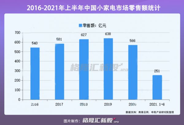 但是,随着后疫情时代的到来,进入2021年,小家电市场出现明显降温,行业出现平台期。奥维云网数据显示,今年上半年,小家电零售额共计250.8亿元,同比下降8.6%;零售量11911万台,同比下降8.2%。