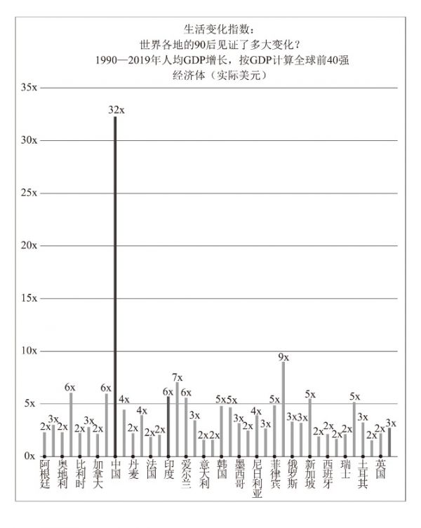 作为美国的 90 后(我出生于 1990 年),我经历的人均 GDP 增长约为 2.7 倍,紧跟在我们后面出生的就是数字土著一代,他们只知道数字世界。首先是互联网——我还记得用我们家电脑拨号连上“美国在线”的声音;接下来是手机——世贸双子塔在“9·11”袭击中倒下之后,父母给11岁的我配了第一部手机,这样我们就能随时保持联络;再到智能手机、社交媒体、手机银行、电动汽车、大数据、可再生能源,还有即将到来的基因治疗和太空私人旅行。跟我作为美国千禧一代经历的2.7倍增长相比,中国90后见证的人均GDP增长是32倍。过去30年间,中国这个世界比我那个世界的发展速度快了整整一个量级,这个世界的环境也有如猛湍飞瀑,奠定了他们对家庭、政府、技术、工作、金钱、旅游、食品、童年和变化的态度。