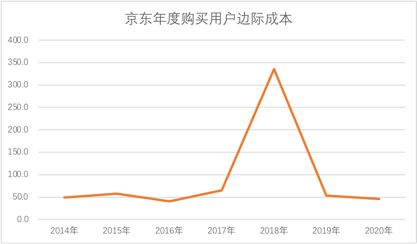 其二,我们引入用户增长边际成本这一概念(用户增长边际成本=年度新增市场费用/年度购买用户净增),发现京东集团层面获客的成本都在一个可控的低成本区间,联系上述公式,如若获客成本维持在较低水平,那么其GMV的潜力自然可想而知,这也是我们对京东抱以乐观态度的开始;