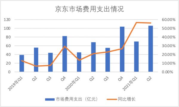 在过去一段时间也确实是如此,京东的市场费用增长一直在可控区间,但进入2021年之后,市场费用出现了明显的跃升,见下图