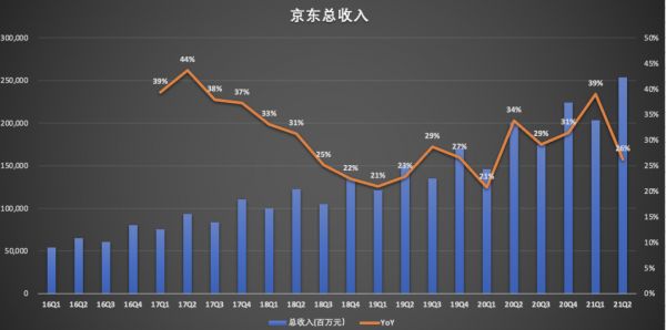 财报显示,2021年Q2,京东收入2538亿元,同比增长26.2%,保持了持续的增长。