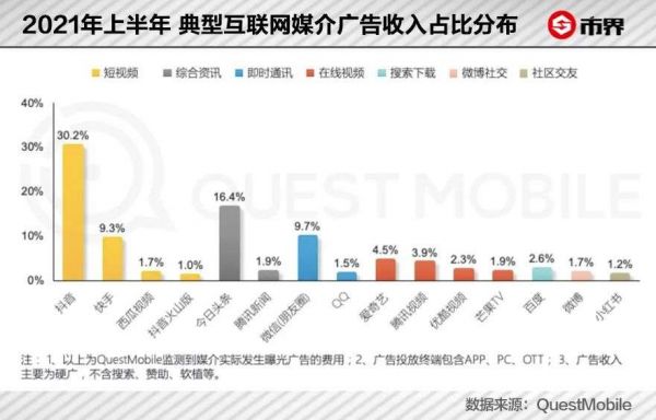 据QuestMobile发布的2021年上半年报告,主要以硬广投放做统计的话,在典型互联网媒介的广告收入分布上,抖音占比达到30.2%,微博占比仅为1.7%。