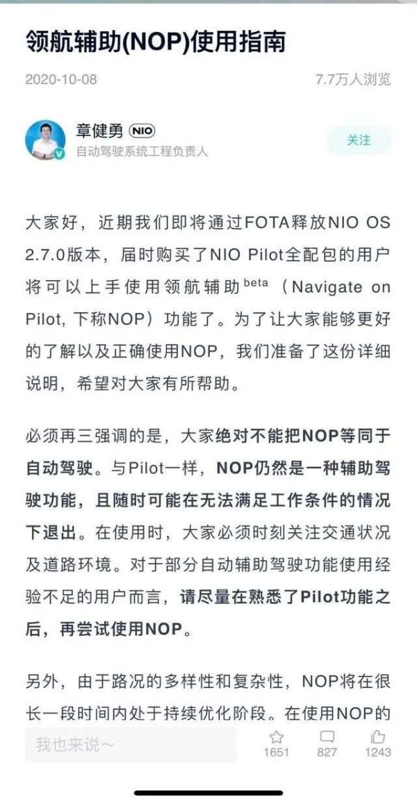 在蔚来汽车APP中,无人驾驶系统工程部的负责人章健勇亦撰文表示“必须再三强调的是,大家绝对不能把NOP等同于自动驾驶。与Pilot一样,NOP仍然是一种辅助驾驶功能,且随时可能在无法满足工作条件的情况下退出。”