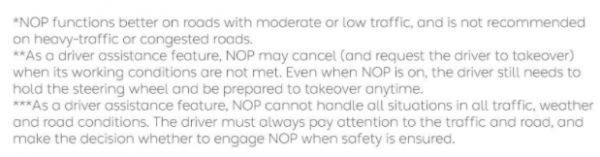 如果直译条款二,我们可以看到“基于实时路况,NOP随时可能自动取消(并且需要驾驶员接管驾驶)。”即使是在打开NOP的状态下,驾驶员也随时可能需要进行接管。在第三条细则里,则再次强调了NOP并不能完全应对所有的道路、交通和天气情况。
