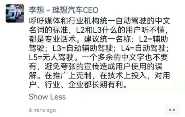 同日,理想汽车创始人李想在朋友圈里发文呼吁媒体和行业机构统一自动驾驶的中文命名,避免夸张的宣传造成用户使用的误解。