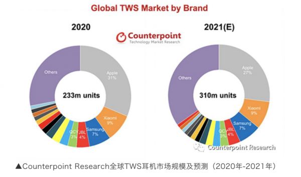 100美元以上TWS耳机市场份额在近两年的收缩,或许也让苹果公司开始产生隐忧,因为除了诸如索尼、Bose这样的“专业级玩家”,苹果是这一价格区间的最主要玩家。苹果公司产生担忧不无道理,Counterpoint Research数据统计,AirPods的市场份额将由2020年的31%,预计下滑至2021年的27%。与此同时,有传苹果计划今年将削减AirPods 25%-30%的产量。