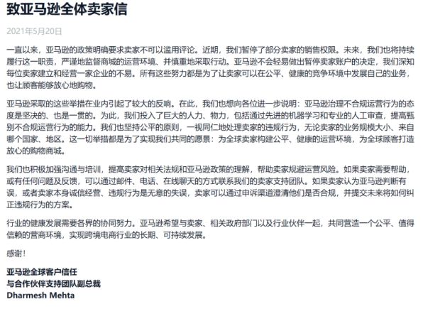 细究此次亚马逊“封号潮”的发端,“打击刷评”有着相当清晰的线索。5月20日,亚马逊在《致亚马逊全体卖家信》中回应封号行动,称“不可滥用评论,大小卖家一视同仁。”随后,6月16日,亚马逊再次公开表示,未来将继续投入资源,对通过虚假评论、奖励性评论获取利益的卖家采取措施。