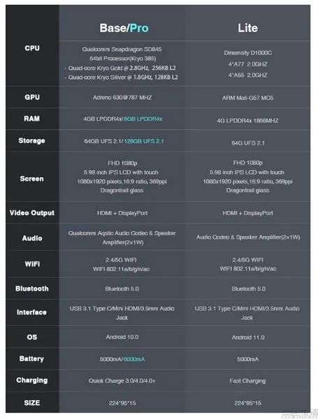 既然有基础版,那么自然也就意味着还有别的版本。例如AYN Odin Pro,就是换用8GB+128GB存储组合(还是UFS2.1),同时将内置电池容量加大到6000mAh的版本。除此之外,AYN Odin还有一个“Lite”版,主控换用了联发科的天玑1000C,同时操作系统版本反而换为了Android 11。