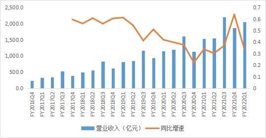 FY2022Q1(2021Q2),阿里巴巴实现营收2057.4亿元,同比增长33.8%,略低于市场一致性预期的2094亿元。收入主要来自于中国零售商业业务、菜鸟物流和国际业务的高速扩张,剔除合并高鑫零售的影响后,本季度营收同比增速为22%。