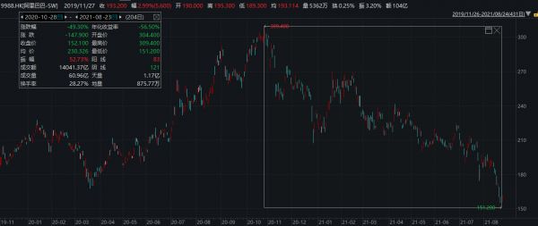 在此背景之下,阿里股价一路下滑,截至8月23日收盘,阿里港股股价已从去年10月底最高的309元/股跌落至152元/股,累计跌幅达到49.3%,创下2019年上市以来的新低。