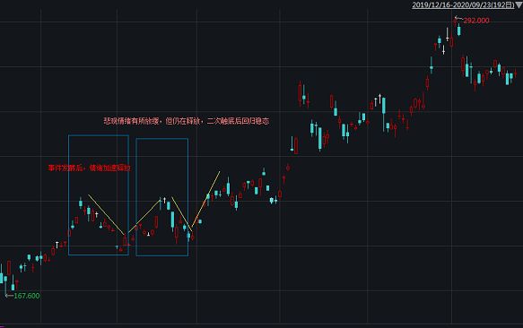 在4月18、19日事件发酵后,4月20日开盘,阿里股价下跌; 到5月5日(2周的周期),股价处在持续下行趋势中,悲观情绪加速释放,期间累计跌幅在7%左右; 5月6日开始,经历小幅反弹后,阿里股价开始处在横盘震荡中,市场悲观情绪有所放缓,但仍在释放; 5月底,阿里股价迎来二次触底,负面事件的情绪危机彻底释放;6月开始股价企稳回归正常周期。