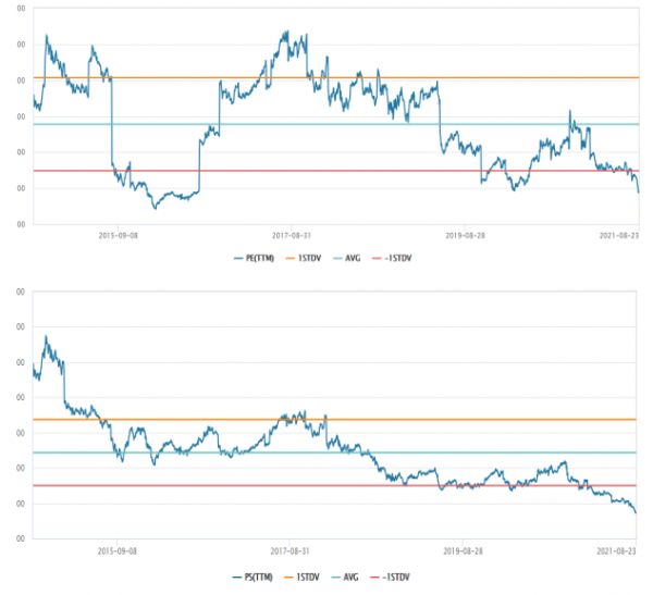 从阿里本身表现来看,目前阿里的PE(TTM)为19倍,不仅明显低于上市以来的历史均值,而且处在在-1倍标准差下方的历史低位;PS为3.7倍,创下了上市以来的新低。这意味着,当前市场估值不仅反映了阿里业绩的缓慢下滑,而且可能已经承载了大量的悲观情绪,考虑到新战略布局下,阿里长期业绩仍具有较强支撑,因此长期的估值吸引力可能已经开始显现。