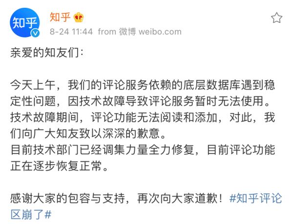 8 月 24 日上午,知乎官方微博对故障问题作出致歉,并解释了问题出现的原因及目前修复进展。知乎官方微博回应称,服务依赖的底层数据库遇到稳定性问题,因技术故障导致评论服务暂时无法使用。技术故障期间,评论功能无法阅读和添加。知乎技术部门已全力修复,目前评论功能正在逐步恢复正常。