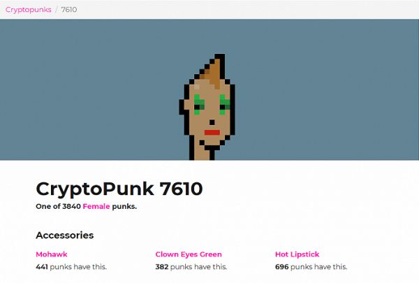 此次被VISA购买的“CryptoPunks”早已是NFT领域中的明星系列,是近日NFT的最热话题之一。它本质是一系列的像素头像,一共约有10000张,其中最值钱的是猿人和外星人形象,外星人Punk只有九张。此次VISA购买的是3840张女性头像之一,外表无特殊之处。