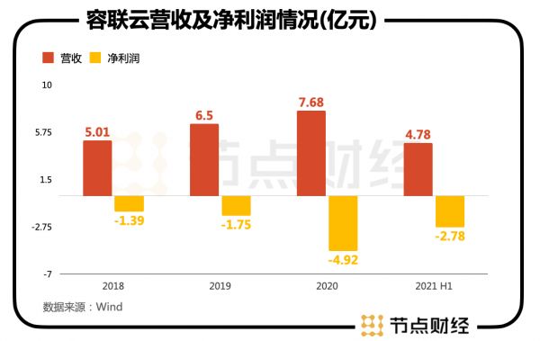 2018-2021中报,容联云营业总收入分别为:5.01亿元、6.50亿元、7.68亿元、4.78亿元。从营收看,小步慢走,仍是向上趋势,但亏损面也在随之扩大。2018-2021中报,亏损分别为1.39亿元、1.75亿元、4.92亿元、2.78亿元。