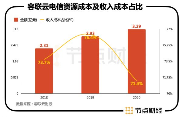 2018-2020财年,容联云的电信资源成本分别为2.31亿元、2.93亿元、3.29亿元,收入成本占比分别为73.7%、76.4%、71.4%。
