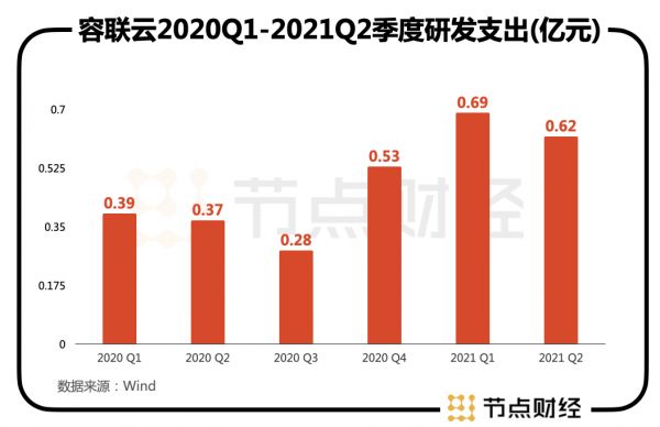 先看近几年的研发费用,2020年Q1-2021年Q2,容联云研发支出分别为0.39亿元、0.37亿元、0.28亿元、0.53亿元、0.69亿元、0.62亿元。去年一整年加起来,也仅1.6亿。但去年亏了近5亿,剩下的钱去哪了?营业成本才是最重要的一环。