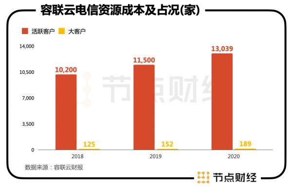 除了留存率下降,对于TO B行业而言,保持大客户的增长是最重要的成长指标。2018-2020年,容联云活跃客户数分别超过10200家、11500家和13039家企业,其中大企业客户分别为125家、152家和189家。从去年的规模占比看,1.3万家客户仅有不足200家大客户,大客户占比约为1.45%,占比较低。