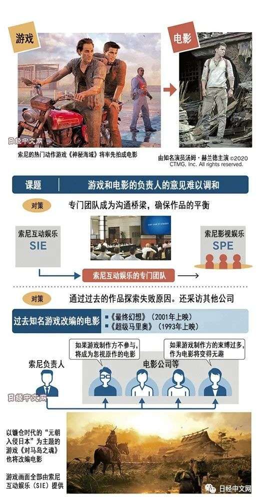 索尼集团将挑战游戏作品的影视化。拍摄热门游戏《神秘海域》(Uncharted)等10款作品的电影或电视剧。尽管游戏改编的电影很少走红,在影视行业里甚至被称为“诅咒”,但索尼的游戏和影视团队将在同一个工作室常驻并携手挑战这一业务。为了对抗美国奈飞(Netflix)等大型视频网站,索尼将以游戏为王牌,作为内容企业不断增长。