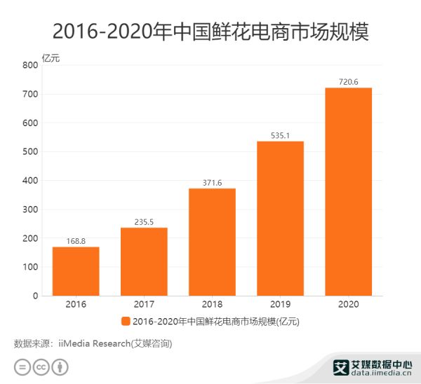 数据显示,2016年中国鲜花电商市场规模为168.8亿元,而到了2020年,这一数字已达720.6亿元。