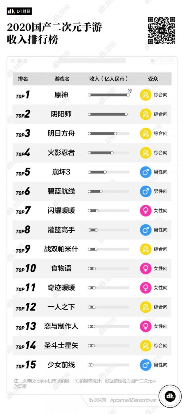 我们统计了中国2020年收入排名前十五的国产二次元手游。排名前三的手游分别是《原神》《阴阳师》和《明日方舟》,这三个手游都是国产的IP,也都是非常典型的抽卡手游。