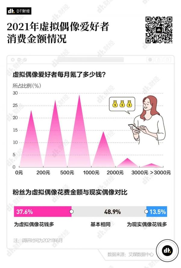 有接近一半 的二次元用户为虚拟偶像每月花费超500元, 只有23.2%左右的人为虚拟偶像花的钱少于200块钱。
