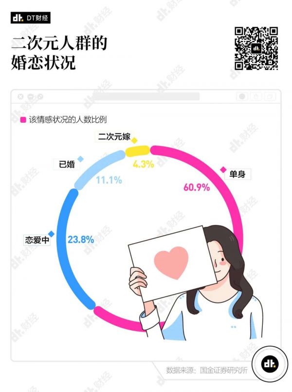 在国金证券研究所对于二次元人群婚恋状态进行的调查中,二次元人群中有60%以上的人是单身,而在他们当中,有很多人并不觉得自己“孤单”。还有4%的人,发自真心的认为二次元人物是他们真正的灵魂伴侣。