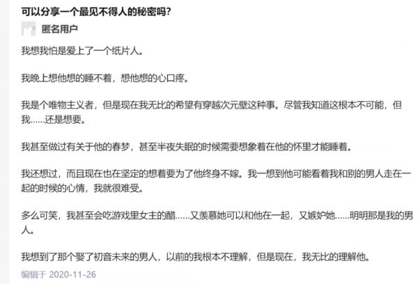 我们同时也发现,人们也会真实的为无法与二次元人物在一起而痛苦。 知乎上一名匿名用户在“分享一个最见不得人的秘密”这个话题上,痛苦地说: “我爱上了一个纸片人。 虽然我是个唯物主义者,但是现在我无比的希望有穿越次元壁这种事,尽管我知道这根本不可能,但我……还是想要。 ”