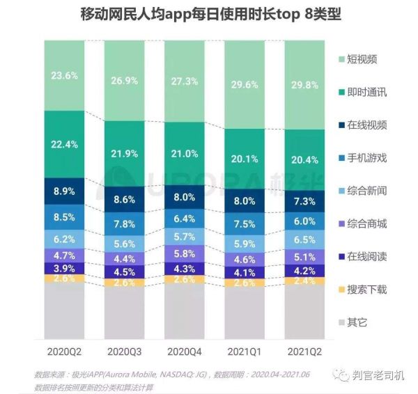 俗话说事出反常必有妖。我翻阅了这几篇奇文,发现他们无一例外援引了极光8月2日发布的《2021年Q2移动互联网——行业数据研究报告》,尤其是其中这张图表的数据: