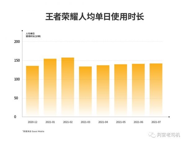 另一方面,极光这份报告中提到,2021年6月,短视频行业的用户人均日使用时长达90.7分钟。我查了下QuestMobile的数据,去年到今年,《和平精英》的人均时长峰值出现在2020年3月,为139.44分钟,今年7月为110.38分钟;《王者荣耀》的人均时长峰值在2020年2月达到193.57分钟,今年7月为141.78分钟。
