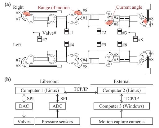 日本东京大学的研究人员近来研发了一款名为Liberobot的气动仿人机器人。并针对气动仿人机器人开发一种立即生成和执行跳跃和打击运动的方法。该方法使用学习动力学查找表(IMoLo)进行即时运动生成,该方法使气动仿人机器人能够即时生成运动以响应不断变化的目标。Liberobot仿人机器人是第一个能够执行此类动态运动的气动仿人机器人。