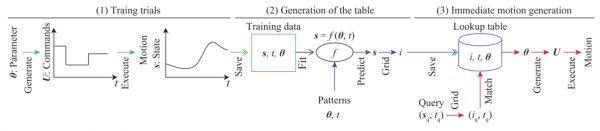 使用IMoLo的机器人可以使用查找表(下图所示)立即生成运动,该表显示了使用机器人的手在所需时间到达目标位置的命令的时间序列。因此,机器人也可以在适当的时间开始这种运动,并在目标时间将手伸到该位置。机器人不需要遵循任何轨迹,它只需要执行命令。