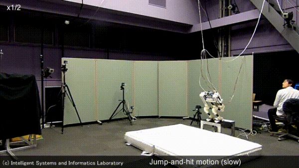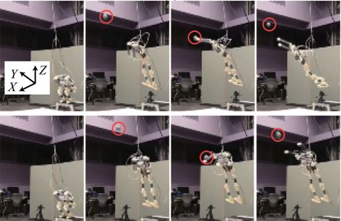 实验过程中,研究人员将球从距离机器人约5米的地方扔出去,并在1秒后落到机器人面前。然后机器人会根据动作设置向前跳跃并在空中击球。研究人员利用机器从两个不同的位置向不同方向扔球20次。结果表明,机器人在20次试验中击球16次,成功率为0.8,这可以说明机器人可以成功实现跳跃击球动作。