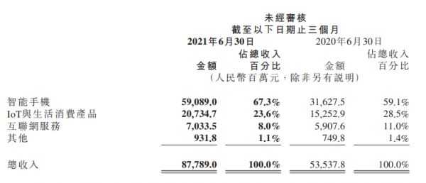 这一部分业务的收入也达到了207亿元,同比2020年第二季度的59亿元增长了250.8%,环比2021年第一季度的182亿元增长了13.7%,但占总收入的占比却有所降低,原因是,手机业务收入占比的进一步提高。