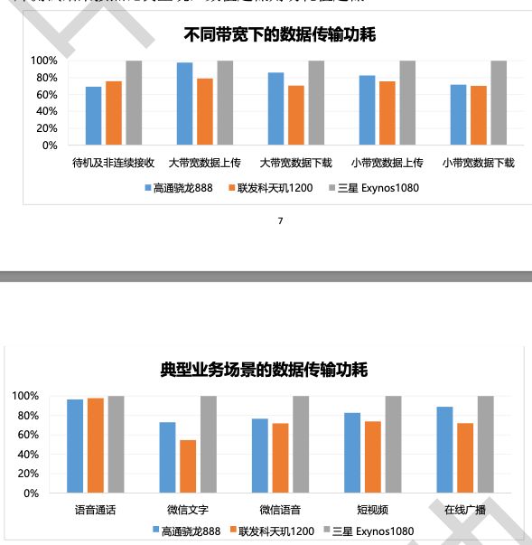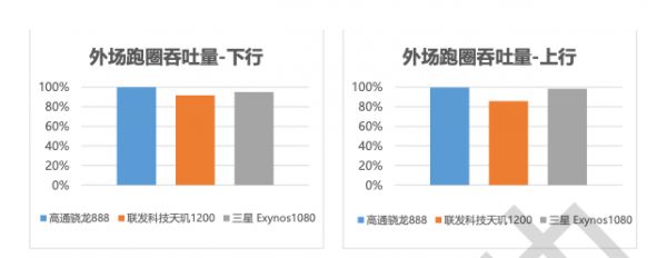 结果显示无论在下行(接收)还是在上行(发送)环节中,高通骁龙888芯片的表现都要优于天玑1200和三星Exynos1080。其中三款芯片在下行测试中的结果较为接近,最大性能差距仅为10%。
