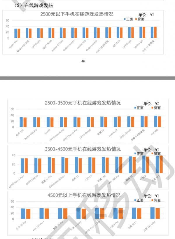 手机的发热测试也同样出乎大家意料。一般来说,旗舰手机由于配置更高,发热相对会更加严重,这也导致手机发热情况已经是我们挑选手机时的重要指标。但在测试报告中,8款4500元以上的手机在游戏时发热情况都大致相同,彼此之间并没有太大差异。