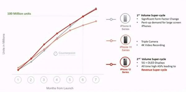 另一项数据显示,iPhone 12仅用了7个月的时间,就达成了1亿部出货量的壮举。一个直观的对比是:上一个实现此成就的苹果手机,还是7年前发布的iPhone 6系列。