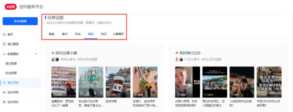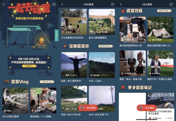 从创作环境来看,小红书官方鼓励旅游打卡等内容的分享。在小红书创作服务平台的“笔记灵感”板块,出行被列为六大经典话题之一,指向粉丝们长期关注和喜爱的选题。同一板块的热门活动中,也包括“一起去露营”等旅行出游相关话题。
