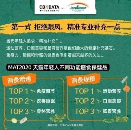 根据CBNData的数据,在天猫购买保健品的人群中,约40%为90后,30%为80后~90后,而且90后人群占比持续增长,消费人群日趋年轻化。