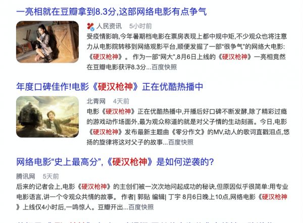 从评分角度来讲,对院线电影起作用的豆瓣、猫眼、淘票票评分,对网大没有任何可参考性。现在新入局网大的院线电影玩家开始讲豆瓣评分的口碑故事,比如《硬汉枪神》就将豆瓣评分8.3分作为高口碑营销的方向。