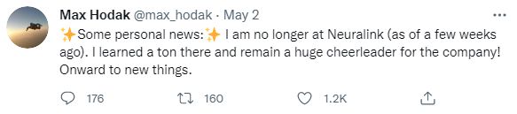 Neuralink 的联合创始人Max Hodak 今年五月二号在推特上宣布几周前就离开公司了,但没有具体说明是与马斯克意见不合或是临床试验进展不顺而被解雇。