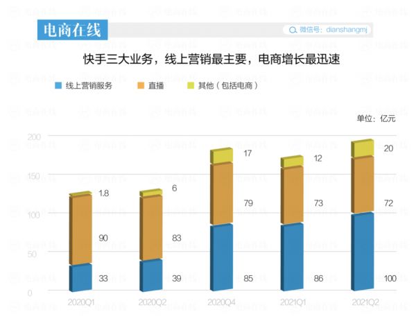 快手的三大块业务中,其他业务(包括电商)增速最快,且占比也从去年同期的6%增加到20%。