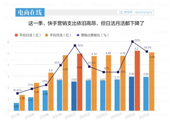 快手的获客成本也在水涨船高。「电商在线」按推广投入/拉新用户计算,2018年,拉到一个新日活用户的成本是86元,此后的2019年和2020年,分别为168元和302元,上一季度则高达487.5元。
