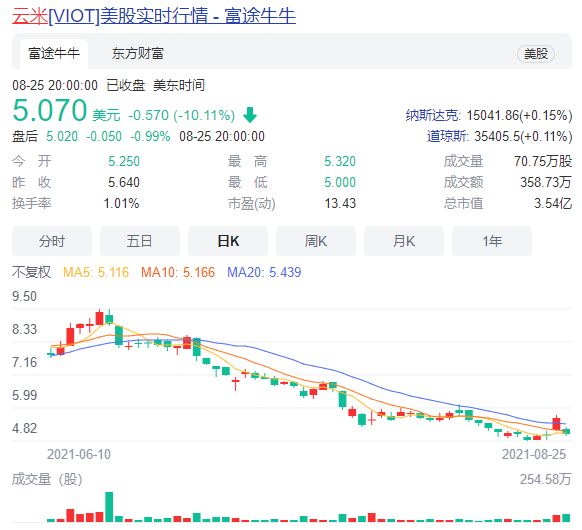 但从今年资本市场来看,云米科技的表现似乎不尽如人意。上市时发行价为9美元,截至发稿时间,云米科技股价为5.07美元,比今年3月份高峰值股价13.5美元跌去六成。