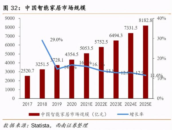 根据 Statista 的数据,2025 年中国智能家居市场规模有望翻倍达到8182.8 亿元,预计2017-2025 年的复合增长率为 15.8%。且据兴业证券经济与金融数据,目前我国智能家电产品的渗透率较低,不到10%。
