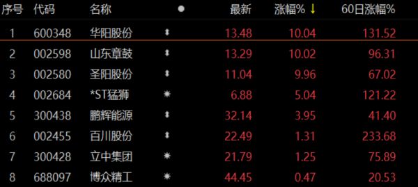 在钠离子电池板块相关的股票中,华阳股份、山东章鼓、圣阳股份涨停,并且近60个交易日累计涨幅达到了131.5%、96.3%和67%。