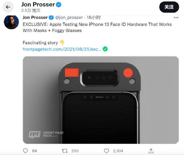 智东西8月26日消息,据爆料人士乔恩·普罗瑟(Jon Prosser)称,苹果正在测试新的Face ID硬件。当你戴着口罩时,新硬件也能完成人脸识别。