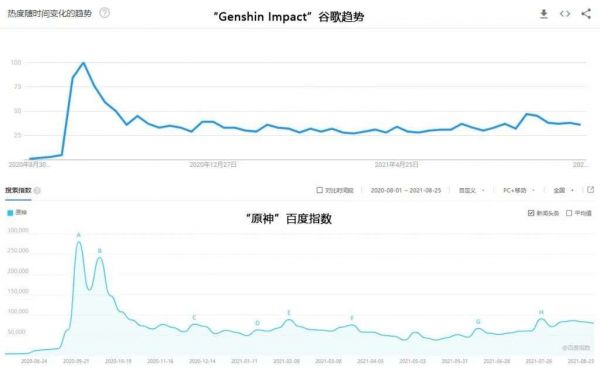 根据百度指数和谷歌趋势,在上线后近一年的时间里, “原神”和“Genshin Impact”的搜索热度一直保持在一个稳定水准,在“原神2.0”更新之时还有小幅上涨,足以见《原神》的热度十分坚挺。